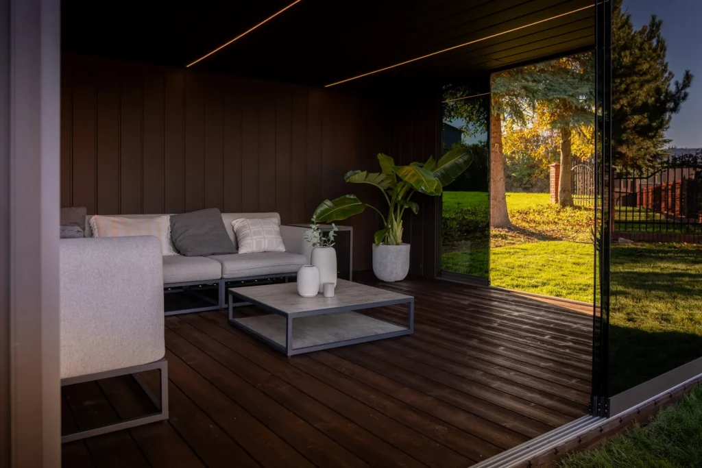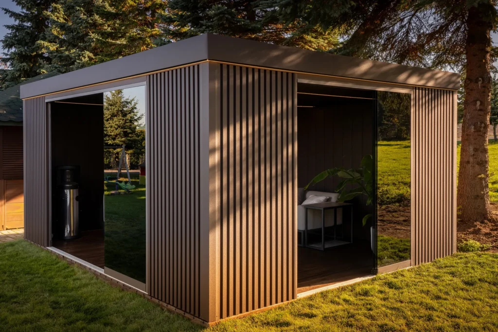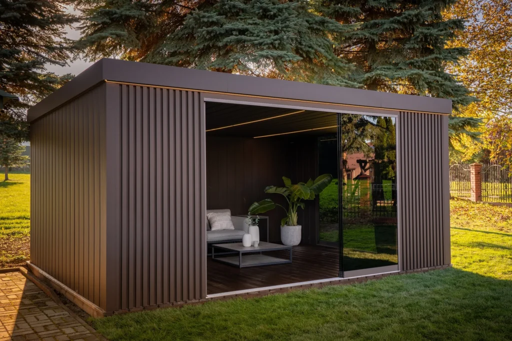 - Der schokoladenbraune Farbton fügt sich harmonisch in die Gartenumgebung ein und verleiht dem Raum einen eleganten, dezenten Charakter.